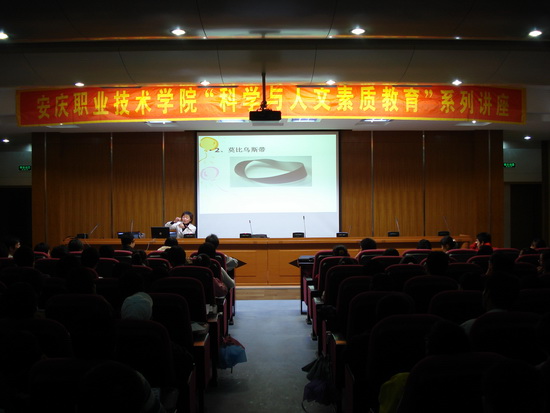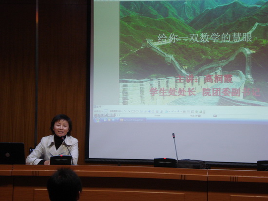 10月30日晚,2008――2009学年度第一学期“科学、人文、艺术素质教育系列讲座”继续进行,院学生处处长、团委副书记高润霞作“给你一双数学的慧眼”专题讲座。