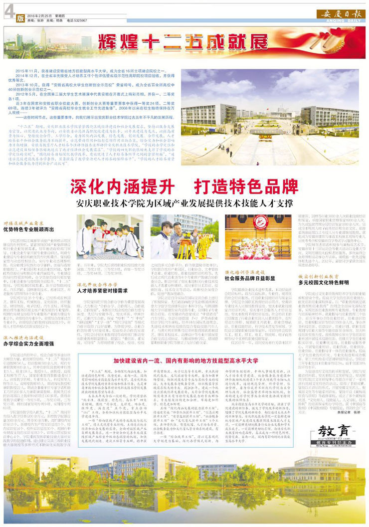 2016年2月25日,《安庆日报》“辉煌十二五成就展”栏目以《深化内涵提升 打造特色品牌 beat365中文官方网站为区域发展提供技术技能人才支撑》为题,专题报道我院“十二五”时期改革发展情况,并介绍我院“十三五”时期加快建设地方技能型高水平大学的思路和举措。