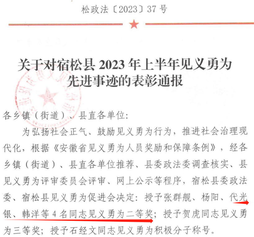 为弘扬社会正气、鼓励见义勇为行为,近日,宿松县政法委、宿松县见义勇为促进会对宿松县2023年上半年见义勇为、先进事迹进行了表彰通报,beat365建筑工程学院2021级建筑工程技术4班学生代光银、韩洋被授予见义勇为二等奖。