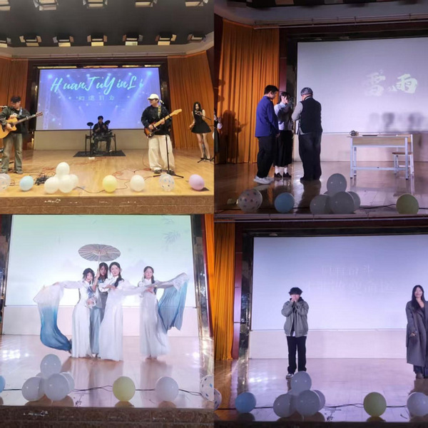 汇演在歌曲《我们的时光》中拉开帷幕,经典话剧《雷雨》演绎中,同学们用真挚表演再现文学魅力。随后,优雅的《兰亭序》古风舞蹈与《李白》等流行歌曲串烧相继登场,实现了传统韵味与现代节奏的巧妙衔接。《等你下课》《飘向北方》等歌曲引发全场共鸣,而充满活力的街舞和集体舞则将现场气氛推向高潮,充分展现了青年学子的多元才华与蓬勃朝气。