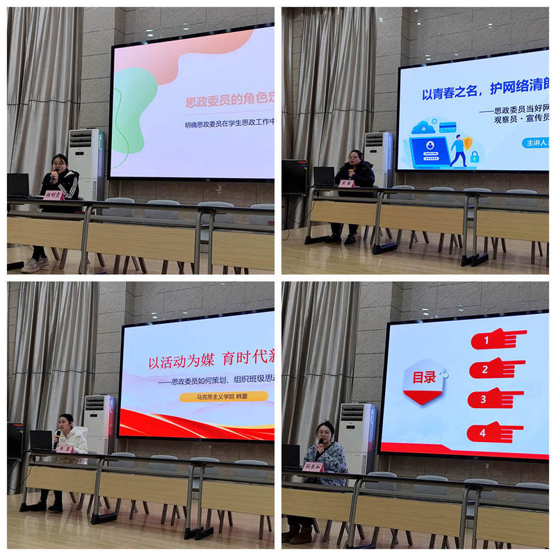 马克思主义学院教师任利霞,以“小委员大作用——思政委员的角色与定位”为主题,从角色定位、作用发挥、成长发展三方面系统阐释了思政委员的使命与担当。她表示,思政委员是贯通“学校——学院——班级”三级思政网络的关键纽带,需要以精神品格涵养、理论素养提升、实践技能锤炼为核心,当好思政课教育小能手、思政课教师小助手、辅导员老师小帮手、师生沟通交流桥梁、同学成长的模范。