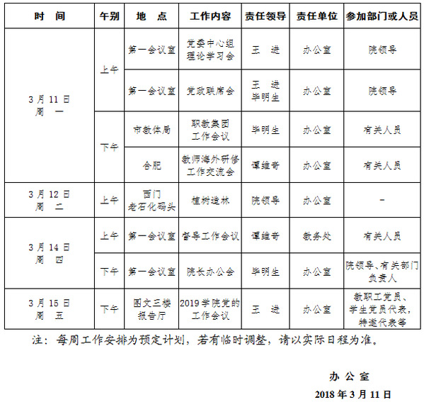 2018-2019学年第二学期第4周(3.11-3.17)工作安排