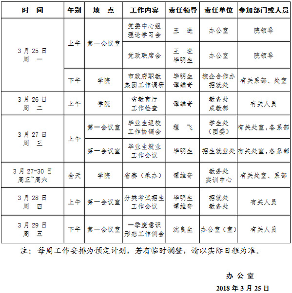 2018-2019学年第二学期第6周(3.25-3.31)工作安排