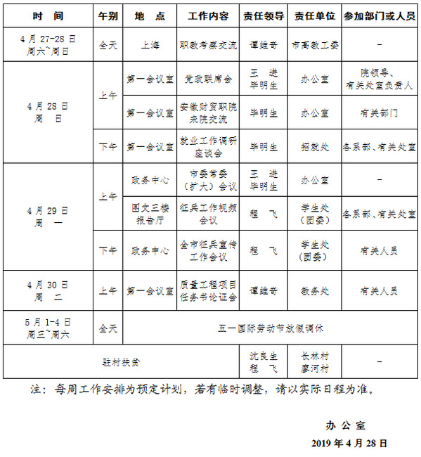 2018-2019学年第二学期第11周(4.29-5.5)工作安排