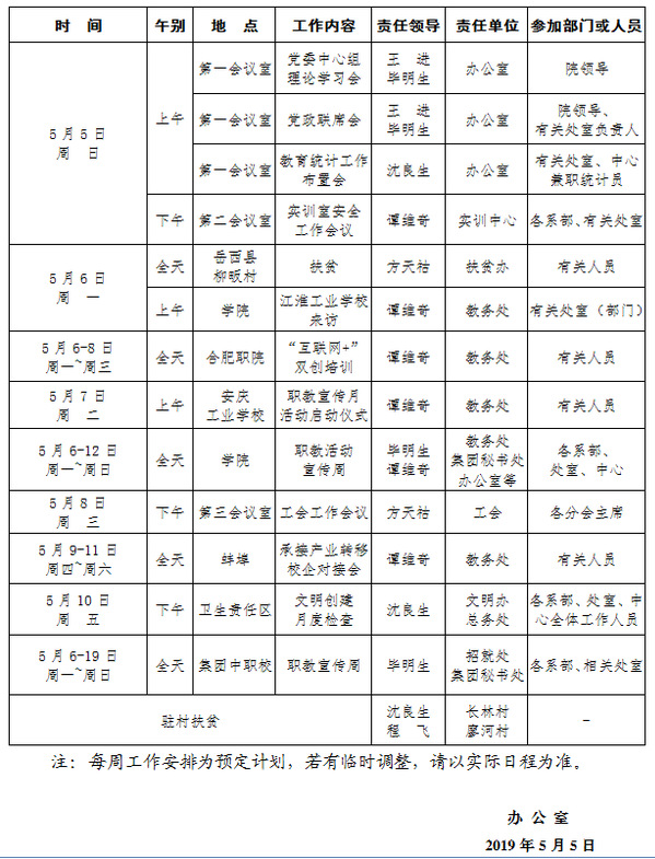 2018-2019学年第二学期第12周(5.6-5.12)工作安排