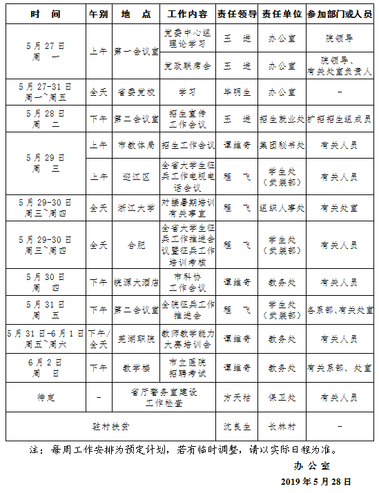 2018-2019学年第二学期第15周(5.27-6.2)工作安排