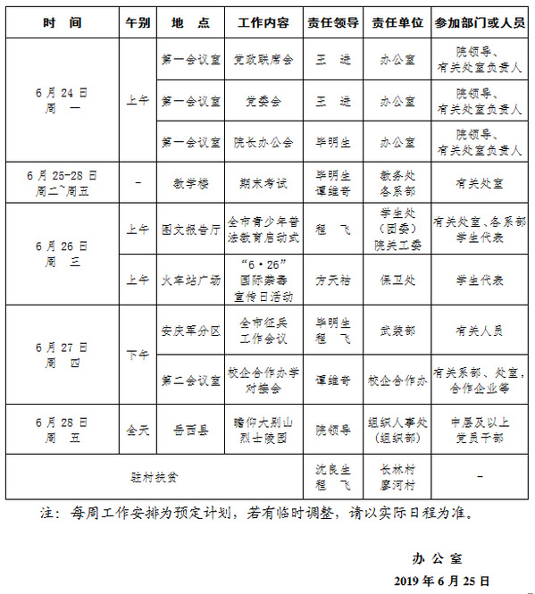 2018-2019学年第二学期第19周(6.24-6.30)工作安排