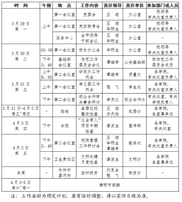 2020-2021学年第二学期第5周(3.29-4.4)工作安排