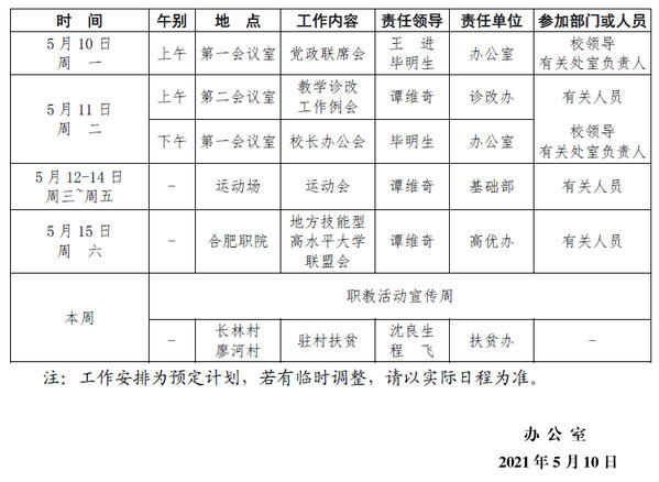 2020-2021学年第二学期第11周(5.10-5.16)工作安排
