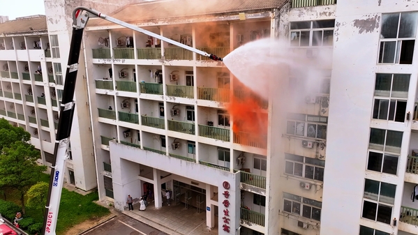 听到警报声,学校安保人员立即启动应急预案并进入紧急状态。紧接着,消防员迅速到达现场,架起了消防升降设备,侦察高层是否有未及时撤离人员,并用高压水枪对高层进行“灭火”。巨大的水柱从水枪中喷涌而出,直扑“火源”,迅速消灭“火情”。整个过程规范、有序、紧凑、高效,未发现有人员受伤或滞留情况。