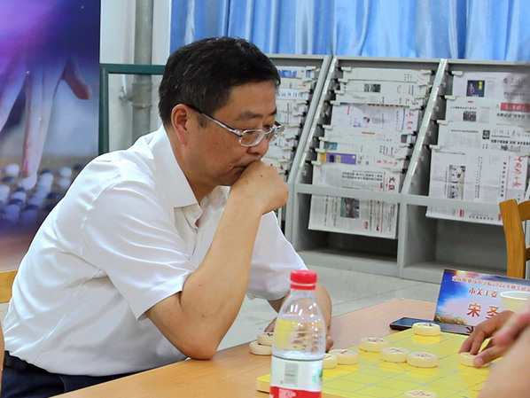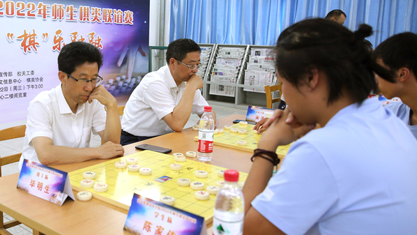 6月22日下午,beat365中文官方网站图文信息中心二楼阅览室拉开阵势,一场别开生面的师生围棋、象棋联谊赛即将开赛。4盘围棋和8盘象棋依序摆开,校党委书记童宏葵作为教职工队围棋队员与乔隆基同学对弈,校长毕明生作为象棋队员与陈家伟同学对弈;比赛还特邀了2位嘉宾,安庆市关工委主任宋圣军与汤厚庆同学对弈象棋,市关工委常务副主任、秘书长李跃云与吴召勤同学对弈围棋……这场联谊赛由校工会、党委宣传部和校关工委主办,校团委、图文信息中心和棋类爱好者协会协办。校党委委员、副校长、工会主席程飞和党委委员、宣传部长吴何珍参加活动。