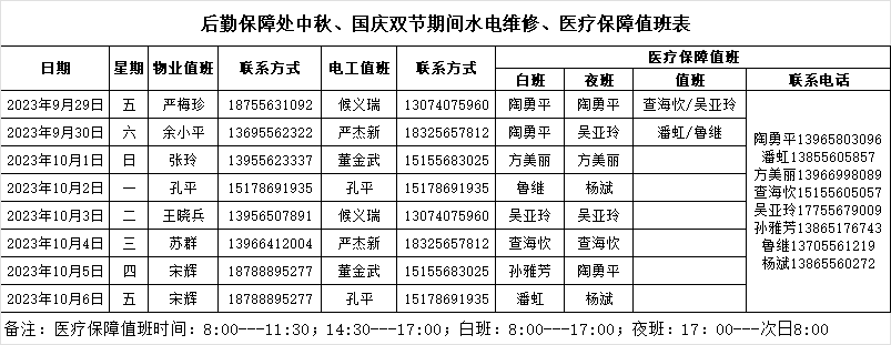 后勤保障处中秋、国庆双节期间水电维修、医疗保障值班表