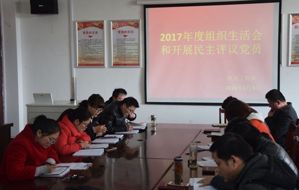 3月9日下午,机电工程系党总支在一栋教学楼208党务会议室召开了2017年度组织生活会和民主评议党员工作会议。机电工程系全体教工党员参加此次会议。