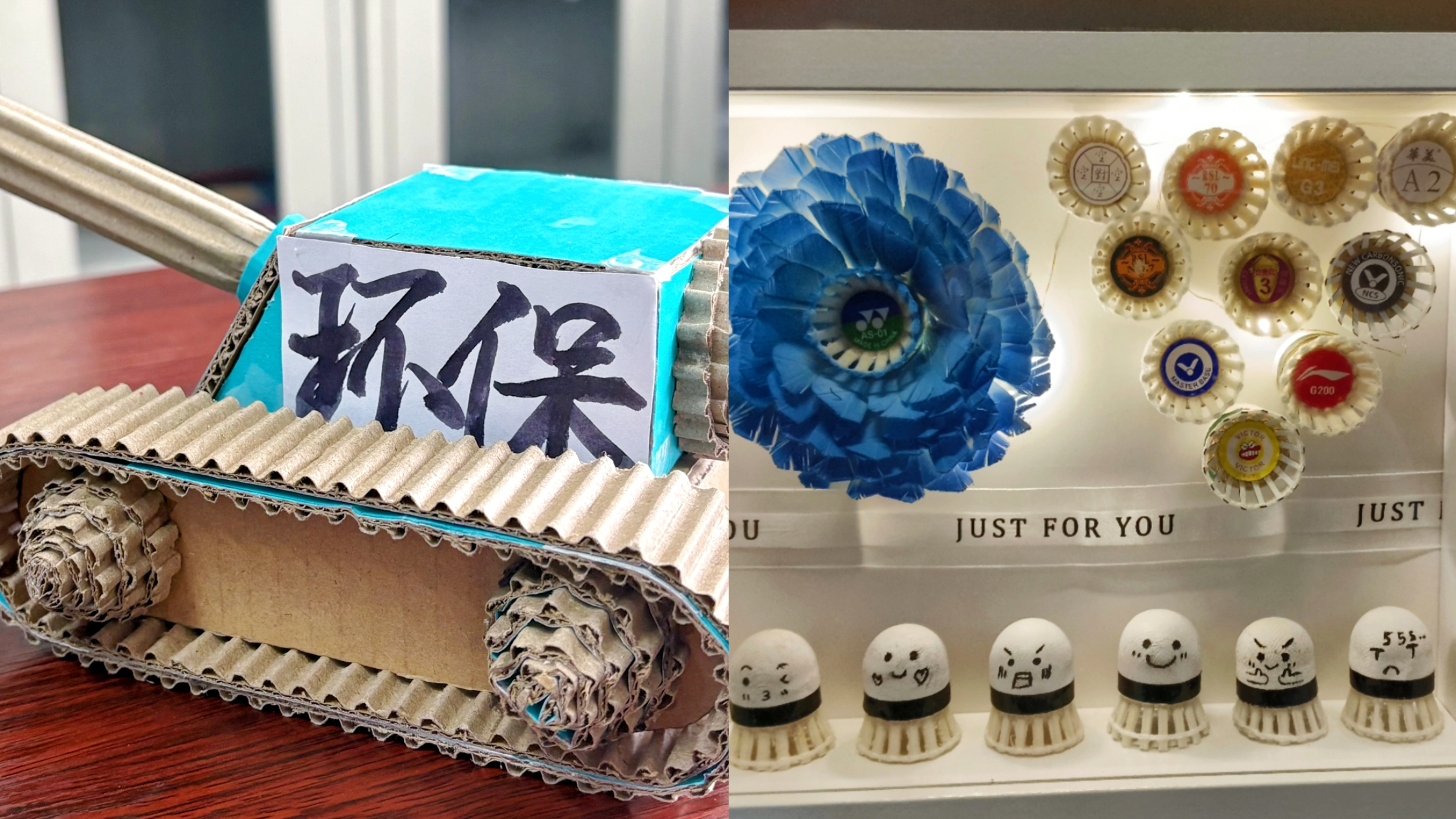 一部分同学将废弃的纸盒、木棒、羽毛球、塑料瓶等改造成为精美的小工艺品,让原本容易被人们丢弃的生活垃圾摇身变成了造型独特的艺术品。如机电专业的梅子升同学兴奋地介绍:“我所制作的环保小夜灯是由废弃塑料瓶、低能耗LED灯以及手绘蝴蝶图案组成,我希望通过它向同学们传递变废为宝这一理念。”数控专业的李孟桥同学拿着他的纸盒坦克,介绍说:“我喜欢军事方面的模型,所以我利用瓦楞纸精心打造了‘环保卫士’坦克手工模型,这也是创意与环保理念的完美融合。”