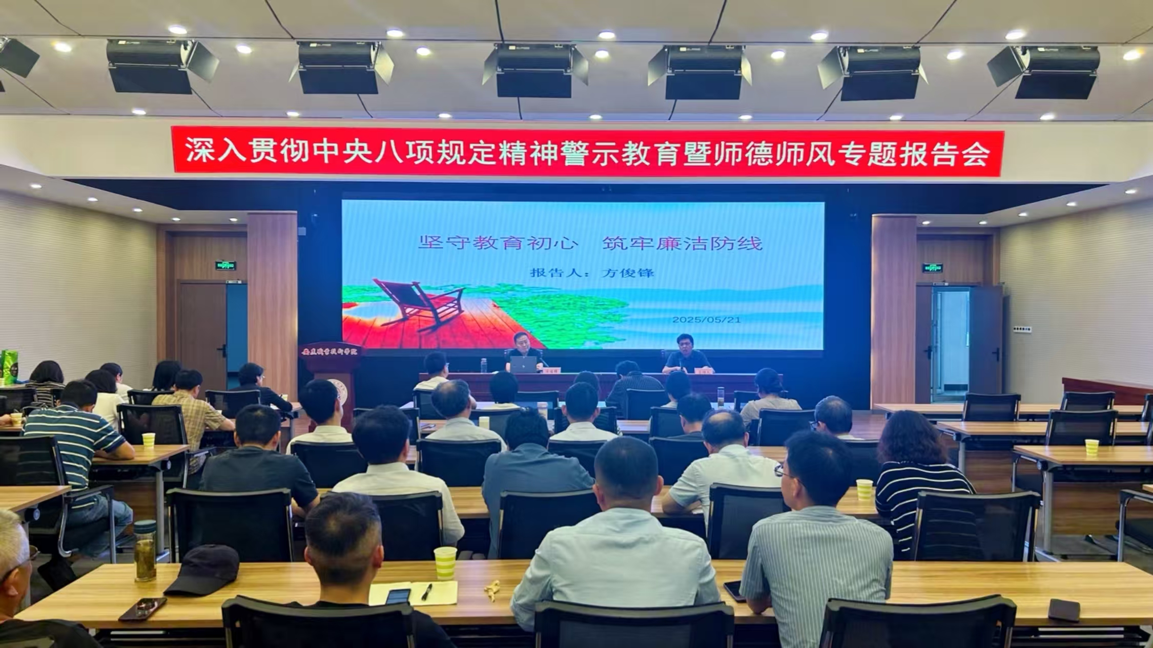 为深入贯彻中央八项规定精神学习教育,进一步加强师德师风建设,5月21日,机电工程学院邀请安庆市纪委监委驻市教体局纪检监察组四级调研员方俊锋来校做深入贯彻中央八项规定精神学习教育暨师德师风专题报告会。机电工程学院全体教职工参加会议,会议由院党总支书记、院长刘磊主持。