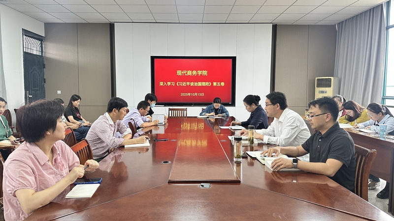 10月15日下午,现代商务学院在党员活动室召开全体党员学习会,深入学习《习近平谈治国理政》第五卷。该院党总支书记金启胜主持学习会。