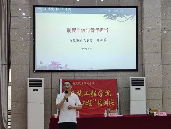 开班仪式后由教学督导委员会委员朱松节进行了青马工程培训班的第一讲《制度自信与青年担当》。他从抗击疫情战疫事迹出发,突出中国特色社会主义制度优势在此展现,鼓励担当民族复兴大任的新时代青年,应牢固树立共产主义远大理想和中国特色社会主义共同理想,牢固树立马克思主义信仰、社会主义和共产主义信念,坚定中国特色社会主义道路自信、理论自信、制度自信和文化自信,从而拥有成就事业、开创未来的强大精神动力。