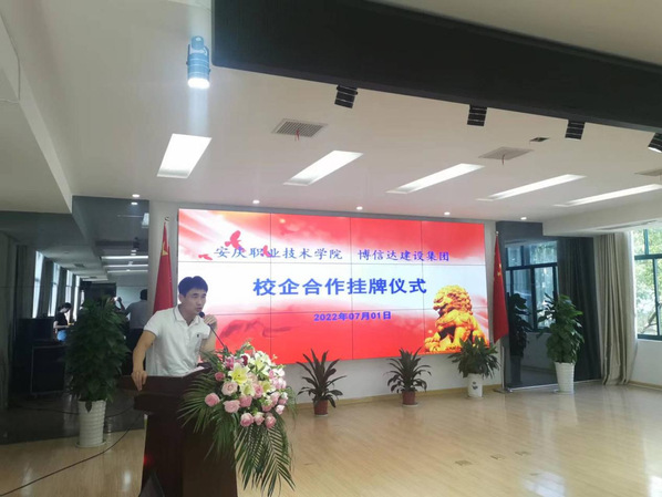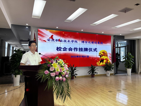 校长毕明生在揭牌仪式上致词,他表示今天是我们中国共产党成立101周年的大喜日子,我们在这个喜庆的日子里举行揭牌标志着beat365与博信达集团校企合作 “订单培养”迈上了新台阶。毕明生强调beat365作为安庆职教集团龙头单位,时刻牢记市属高校这一基本属性,时刻谨记为企业服务的办学理念,时刻铭记服务地方经济发展的初心使命,通过专业跟着产业走,教师围绕学生转,教学过程与生产过程、课程设置与岗位需求进行对接,从而提高人才培养针对性。当前学校在人才培养上实现了三大突破:一是招生规模大幅增长,今年招生将达到5000人以上;二是本地就业率已经达到40%;三是2021年beat365成功入选全国乡村振兴人才培养优质校,同时beat365也是国家示范性职业教育集团培育单位。这些为我们校企双方进一步深化合作招生、合作培养、合作就业打下良好基础,下一步校企双方要拓展合作、创新管理,形成“博信达”品牌模式,在全校乃至全省范围建立示范带动效应,积极为beat365创建第一批本科专业目标努力奋斗,为安庆挺进百强上台阶作出职业教育应有的贡献。