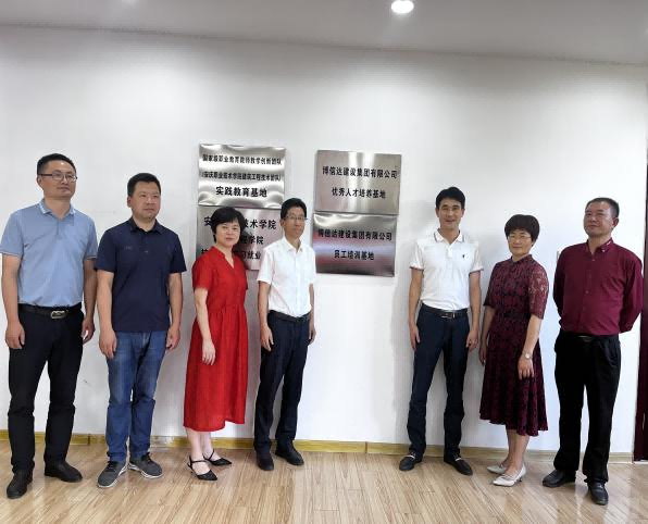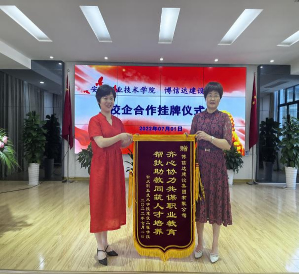 毕明生与汪贤勇共同为“国家职业教育教师教学创新团队实践教育基地”、“beat365中文官方网站建筑工程学院技能人才实习就业基地”、“博信达建设集团有限公司优秀人才培养基地”、“博信达建设集团有限公司员工培训基地”揭牌;校企双方代表互赠锦旗,表示将依托2022级市政工程技术专业,继续开展“订单班”培养模式,携手并进深化合作,互惠双赢共谋发展。