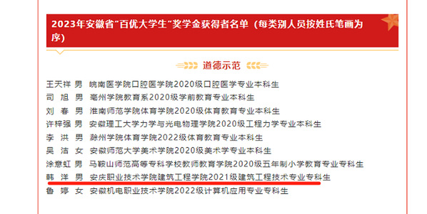 日前,2023年度安徽省“十佳百优”大学生奖学金获得者名单公布。经学校推荐、专家评审团推荐、网络风采展示、特邀评审团推荐等环节,建筑工程学院2021级学生韩洋同学荣获道德示范类2023年安徽省“百优大学生”奖学金。
