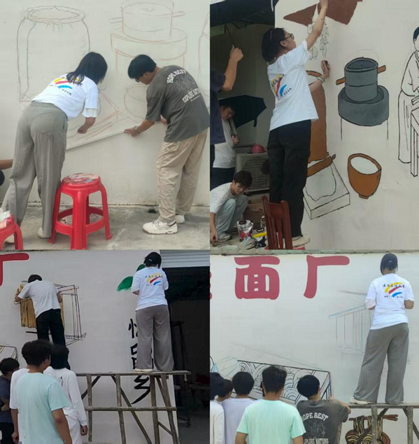 绘图开始前,队员们积极对接挂面加工厂,了解手工挂面的制作工艺并记录,实地测量墙体的面积,根据加工老板的需求设计墙绘效果图。确定好图纸后,开始施工,同学们将墙面彻底清洁打磨,确保颜料附着力;构图以粉笔精准打稿。分色绘制阶段,丙烯颜料在烈日下迅速凝结,同学们轮番上阵,默契配合,以建筑制图的严谨把控每一道线条。当最后一笔落下,挂面制作的和面、开条、盘条、分条、出架、下架等工序的墙绘呈现在忆留乡手工挂面加工厂内。