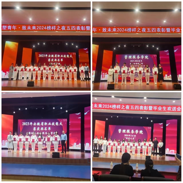 会上表彰了2023年度校级五四红旗团支部、优秀团员、优秀团干、安徽省技能大赛获奖选手、2024届优秀毕业生及2024年3月份的“阅读之星”等优秀集体与优秀团员青年。与会领导与老师为获奖代表颁发荣誉证书并表示祝贺,勉励同学们再接再厉,在今后的学习和生活中再创佳绩。