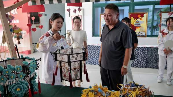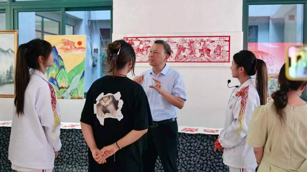 由早期教育与婴幼儿托育服务与管理专业学生带来的剪纸及绘画作品等展现了祖国大好山河和建设成果。2022级张婉茹同学耗时三个月完成的近30米长的剪纸作品《56个民族》,将56个民族的服饰元素融入作品中,每个民族的人物形象都力求生动形象,通过镂空的艺术形式,呈现出各民族的风情和特色。剪纸作品《开国大典》,以天安门城楼和华表为主体,再现75年前开国大典的盛况;剪纸作品《中国梦》、绘画作品《中国航天》、《繁荣昌盛》等均展现了祖国在航天、军事、交通等领域的辉煌成就,剪刻出对伟大祖国的祝福。手工作品灯笼、以黄梅戏服饰为元素的盔帽、非遗绒花等无不展现了管院学子的心灵手巧,以及精雕细琢的工匠精神。