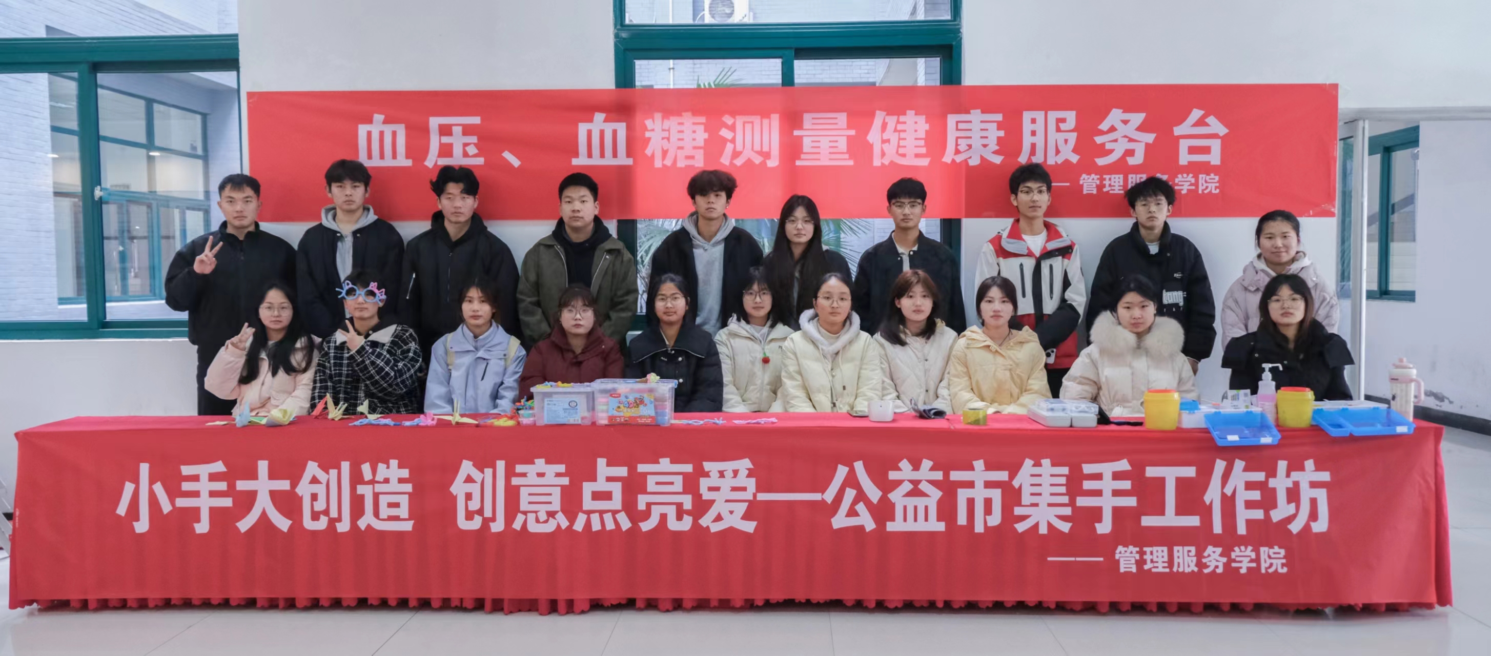 3月5日,在团市委、校团委主办的雷锋公益市集中,“萤火”志愿服务队设立了“健康驿站”与“巧手工坊”两个展位。在“健康驿站”展位,志愿者们为师生们提供免费血压测量服务,现场收集健康数据100余份;“巧手工坊”展位旁,志愿者们推出了黏土手工作品制作、剪纸技艺、非遗漆扇体验,吸引了众多家庭亲子的共同参与。