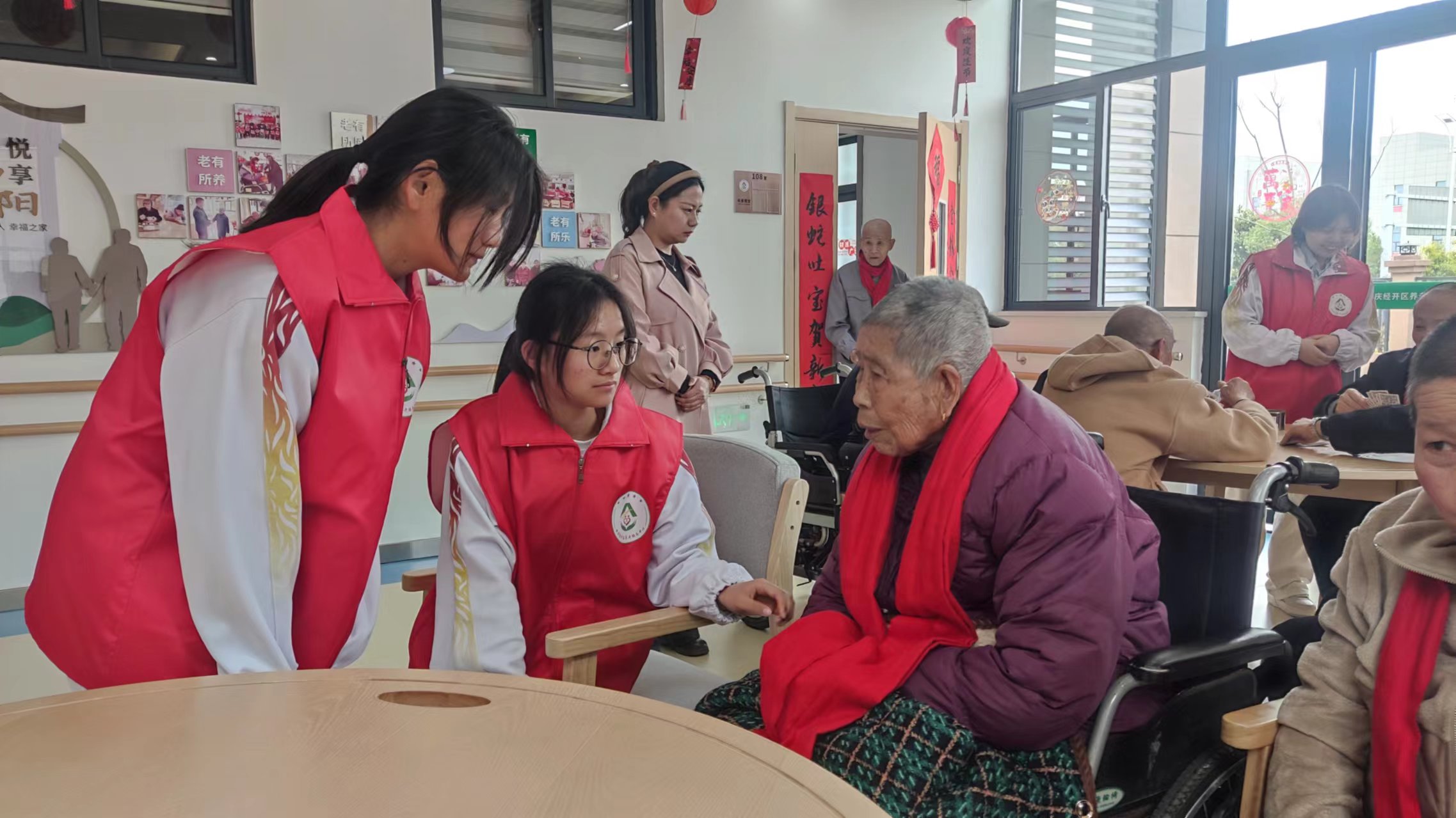3月1日,由智慧健康养老服务与管理专业学子组成的“夕阳志愿服务团”启动了智慧助老专项行动,为安庆市经开区养老服务中心、怡人堂的老人们定制健康服务方案。志愿者们运用《老年护理学》课程知识,开设了“健康小课堂”,通过血压监测、认知功能筛查等专业服务建立健康档案32份,用专业技能温暖银发群体。活动现场,志愿者们示范了“适老化手指操”,教老人们学习手指保健操;他们还为老人修剪指甲、整理房间、陪老人谈心。活动的最后,志愿者与老人们合唱《学习雷锋好榜样》,银发与红马甲在歌声中交织成了一幅温馨画卷。