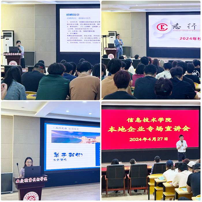 搭桥建梁,邀企话就业。为进一步拓宽毕业生就业渠道,提高毕业生就业质量,同时也为服务地方社会经济的发展。值此毕业生返校之际,我们邀请五家安庆本地企业进行招聘宣讲。他们通过PPT生动地展示了企业的发展历程、企业文化、发展理念、招聘计划等相关内容,详细说明了众多岗位的招聘需求,以及员工的职责、要求、薪酬收入、住宿环境、福利待遇、培养体系和大学培养路径,对毕业生发出诚挚邀请,希望他们能加入企业,共谋发展。