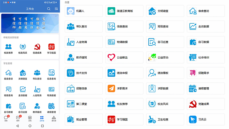 陈富汉围绕“身边的AI智能体”“企业微信常用功能应用”以及“学院自建AI智能体”三方面展开,并现场演示操作流程。他首先讲解了企业微信智能表格在数据收集、处理与可视化分析中的高效应用,显著提升了辅导员事务处理效率。其次,他介绍了学院自主研发的两个AI智能体——“学伴”,该智能体分别接入了DeepSeek-R1和Hunyuan大模型,训练了丰富的学生管理知识库,能做到随时响应,成为辅导员日常工作的得力助手。第三,他介绍了学院自主搭建的“六信工作台”,持续集成和开发了40多个应用,涵盖人走物清、请假管理、宿舍管理、安全管理、招聘就业等多个场景,覆盖了学生日常管理各环节,有效实现了学生管理工作网格化、精细化和智能化。
