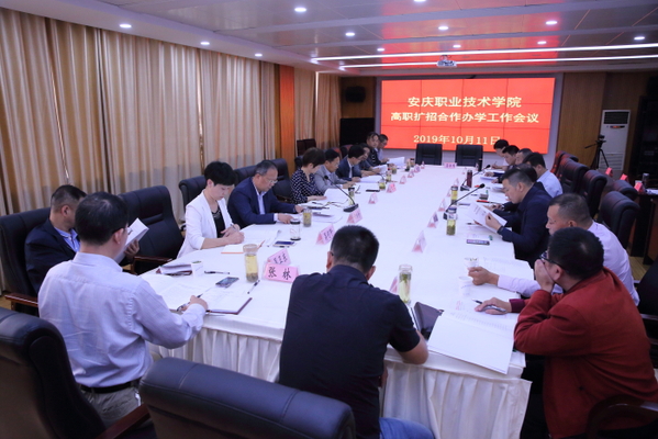 10月11日,我院在综合办公楼第二会议室召开高职扩招合作办学工作会议并举行签约仪式。市高教工委、教体局副书记陈亚玲,我院党委书记王进出席会议并讲话。我院院长毕明生主持会议。与我院合作办学单位安徽化工学校、江淮工业学校、太湖职业技术学校、安庆皖江中等专业学校、安庆大别山科技学校、宜城科技学校和宿松中德职业技术学校校(董事)长出席会议。我院纪委书记方天祜,副院长谭维奇,组织统战部长程飞出席并通报相关工作安排。