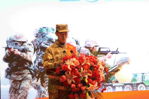 来自信息技术学院的李朋飞代表2025年春季预定新兵上台发言,他首先对学校、老师和家长的培养和教育表达感谢,表示会倍加珍惜入伍机会,今后刻苦训练,加强学习,服从命令,听从指挥,把自己锻炼成为一名“四有”好士兵,成为一名合格的好战士。