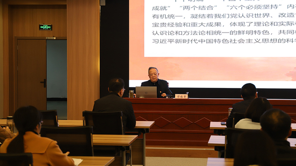 谭维奇从“感悟思想伟力,以学铸魂强党性”“贯彻教育方针,以学正风练思想”“统筹协同创新,以学增智重实践”和“优化类型定位,以学促干强发展”四个方面向全体党员介绍了习近平新时代中国特色社会主义思想的科学体系和历史地位,并结合新时代党的教育方针畅谈职业教育的统筹协同创新、职业教育的基本特征,以及职业教育如何服务高质量发展。