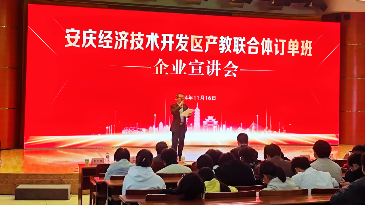 为加强产教融合,助力本地企业人才招引,扎实推动安庆经开区产教联合体订单班组建工作,进一步提升beat365服务安庆地方经济高质量发展能力,2024年11月16日,在校图文信息中心一楼报告厅,举行安庆经开区产教联合体订单班宣讲会,活动分成上下午共两场。校党委副书记李克让出席活动,安庆经开区人社局主管方蕾、校企合作办、招生就业处、机电工程学院相关负责人以及2024级新能源汽车、机电一体化、工业机器人、汽修等专业班级的辅导员、学生共计1000余人参加宣讲会。
