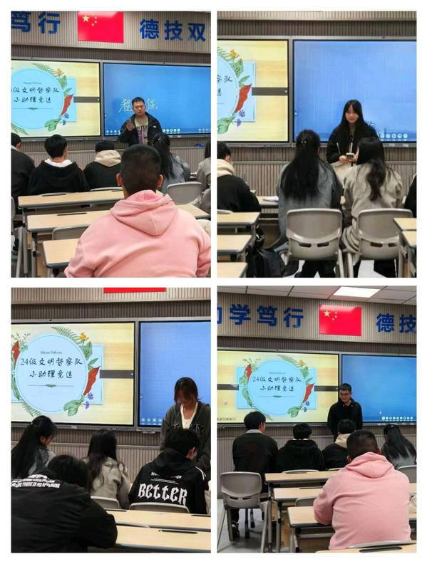 竞选活动开始前,会长刘国庆同学给大一新生介绍了社团各部门的职责和具体分工,以及接下来助理竞选的具体流程安排。随着竞选活动的正式开始,参加竞选的学生们陆续登台,以激情演讲和幽默互动展现专业素养、组织才能和创新思维。他们积极应变提问,分享对文明督察队未来的设想与愿景,现场气氛热烈掌声不断。