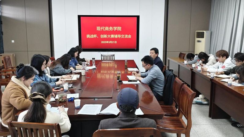 现代商务学院分管学生工作负责人主持交流会。他强调“挑战杯”大学生课外学术科技作品竞赛和大学生创新大赛等各类“A”类学科竞赛的重要意义,要充分发挥赛事育人功能,以赛促学、以赛促教、以赛促创,让各类比赛成为学生展示自我、教师提升能力、学院人才培养的重要平台,鼓励教师将教科研项目进行高效转化,并高效充分整合校院资源,积极指导学生投身各项科研竞赛中。(文/图:马梦婷、徐瑞芳 审稿:李三平)