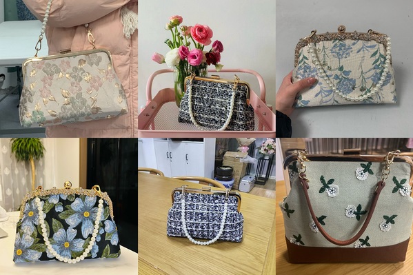 看着色泽鲜艳的材料,对照一个个款式新颖的图片,现场师生兴趣十足,纷纷按照步骤从缝制衬布、贴布、翻面、再到缝合,制作起来。经过穿针引线、“描龙画凤”,一个个手作口金包惊艳亮相,现场气氛活跃,大家互相欣赏、品鉴彼此的手工的精妙及不足之处,沉醉其中,其乐融融。
