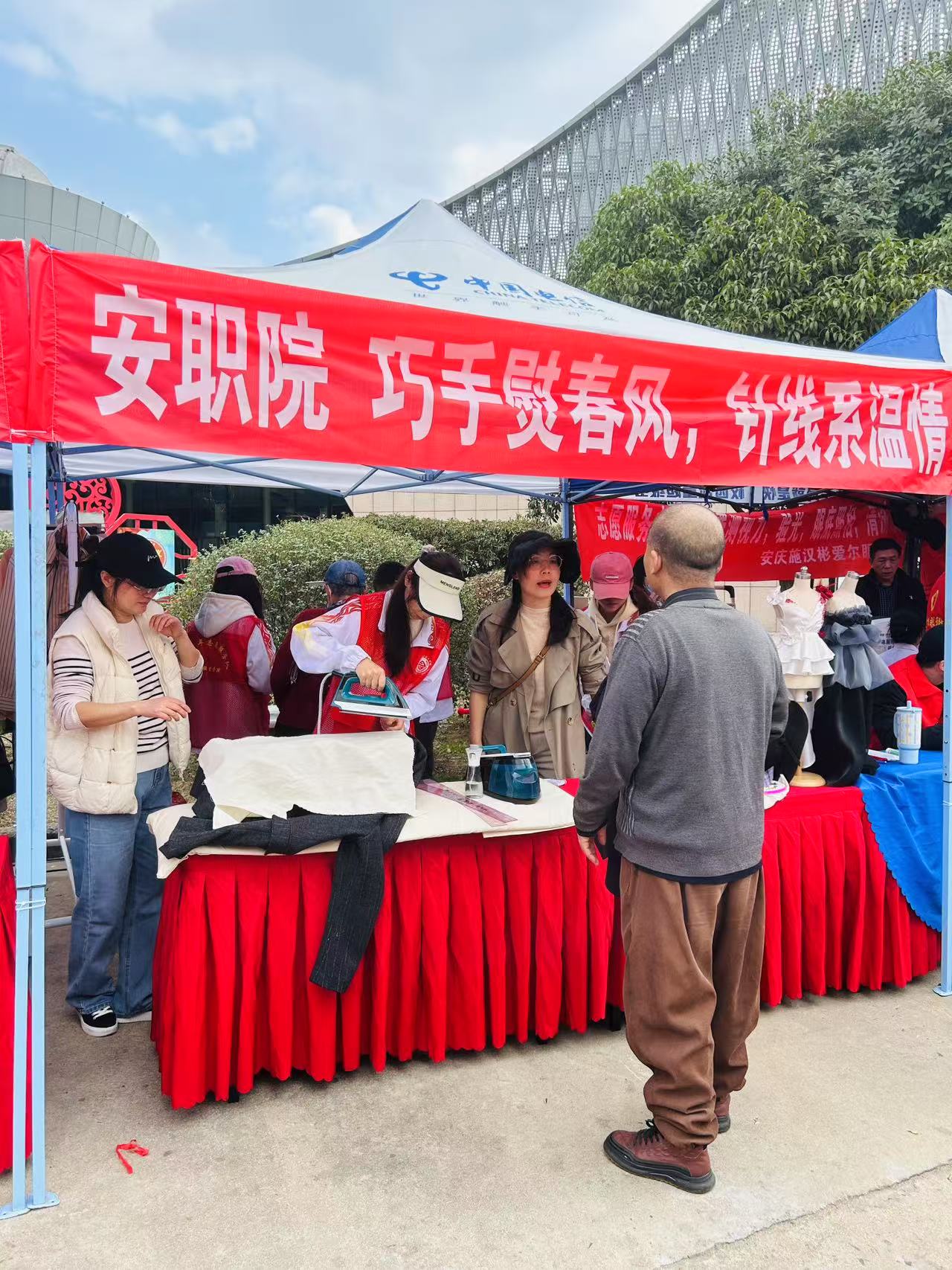 活动现场,服装团队党员教师带领服装设计与工艺专业学生,携带缝纫机、熨烫机等专业设备,为市民提供衣物缝补、熨烫等便民服务。学生们娴熟地穿针引线、调整熨斗温度,细致处理市民送来的衣物。从修补开线的校服到熨平褶皱的西装,志愿者们用专业技能让一件件旧衣焕发“新生”。市民张奶奶拿着缝补好的裤脚连连称赞:“这些孩子技术好、态度更暖心,真是把服务送到了我们心坎上!”