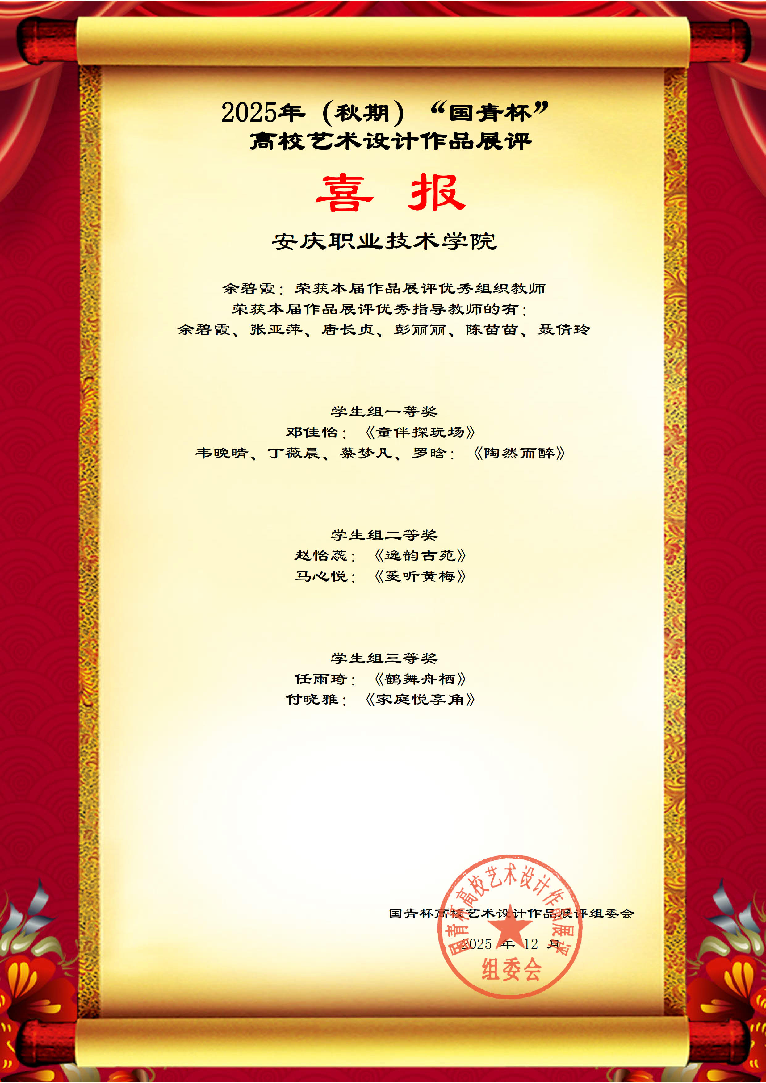 本次征集活动旨在探索艺术设计教育发展新趋势,创新艺术设计人才培养机制,为广大高校师生搭建一个相互交流和提高的平台。经过激烈竞争,beat365园林技术专业邓佳怡《童伴探玩场》、韦晚晴、丁薇晨、蔡梦凡、罗晗《陶然而醉》2件作品荣获学生组一等奖,赵怡蕊《逸韵古苑》、马心悦《菱听黄梅》2件作品荣获学生组二等奖,任雨琦《鹤舞舟栖》、付晓雅《家庭悦享角》2件作品荣获学生组三等奖,余碧霞获本届作品展评优秀组织教师,张亚萍、唐长贞、彭丽丽、陈苗苗、聂倩玲等教师获得优秀指导教师。