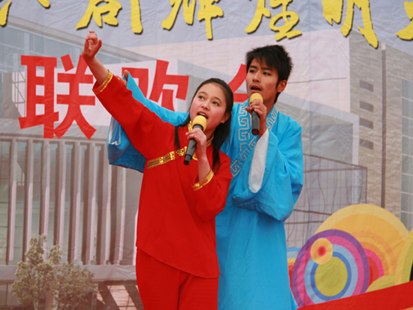 学生在联欢会上表演黄梅戏